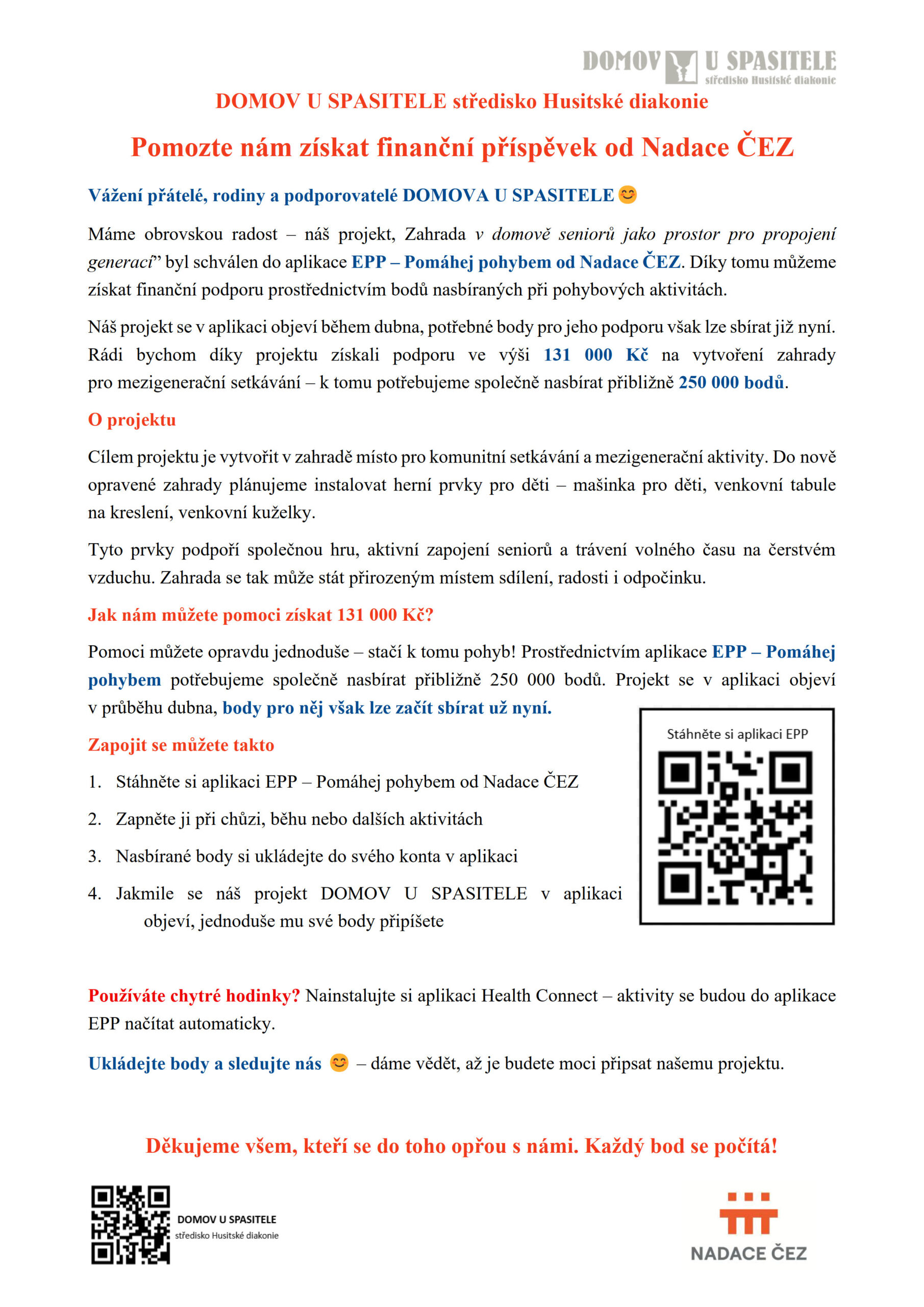 Projekt „Zahrada v domově seniorů jako prostor pro propojení generací” je vložen v aplikaci EPP. Každý váš pohyb se přepočítá na peníze, které nám Nadace ČEZ věnuje.