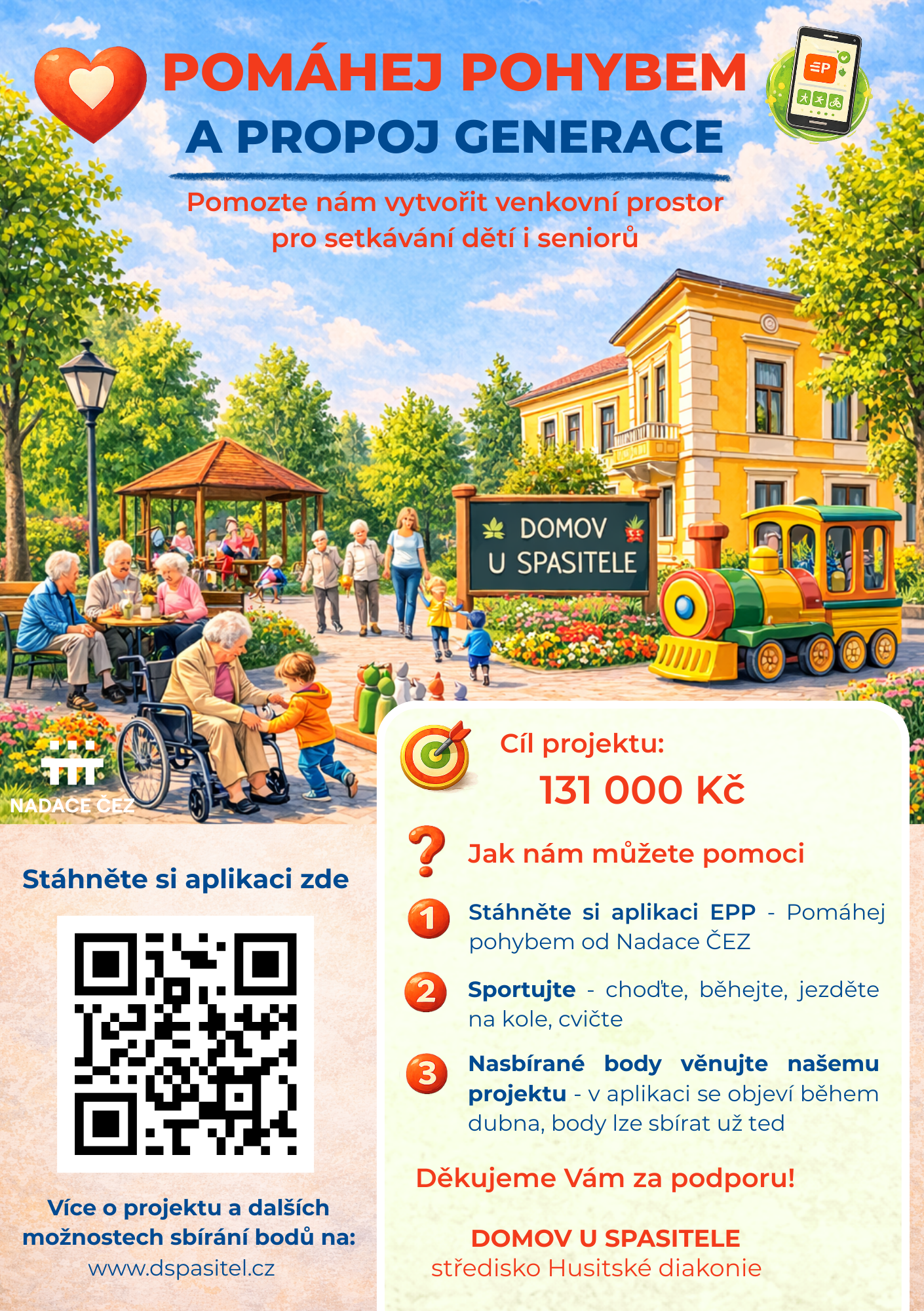 Máme obrovskou radost – náš projekt, Zahrada v domově seniorů jako prostor pro propojení generací” byl schválen do aplikace EPP – Pomáhej pohybem od Nadace ČEZ. Díky tomu můžeme získat finanční podporu prostřednictvím bodů nasbíraných při pohybových aktivitách. Náš projekt se v aplikaci objeví během dubna, potřebné body pro jeho podporu však lze sbírat již nyní. Rádi bychom díky projektu získali podporu ve výši 131 000 Kč na vytvoření zahrady pro mezigenerační setkávání – k tomu potřebujeme společně nasbírat přibližně 250 000 bodů.